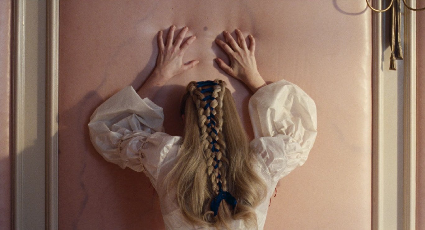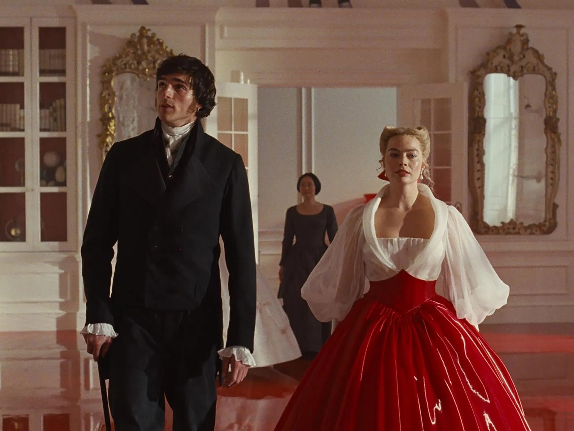 Come già accadeva in Promising Young Woman e in Saltburn, anche qui Fennell dimostra una consapevolezza quasi ossessiva del potere visivo degli oggetti, dei colori, dei tessuti. Nei suoi film, le scenografie non sono mai semplici elementi decorativi: sono dipinti che parlano, commentano, anticipano e contraddicono le emozioni dei personaggi. In “Cime Tempestose”, gli abiti indossati da Cathy servono a suggerire stati d’animo della protagonista: i colori si fanno più freddi o più saturi a seconda dell’emozione che lei stessa sta vivendo, le stoffe diventano più rigide o più morbide, come se il corpo venisse intrappolato o liberato dai sentimenti. L’idea visiva più impattante è proprio quella della pelle umana che fa da sfondo alle mura, come se le pareti delle case fossero fatte della stessa materia dei corpi che le abitano; tutto sembra respirare, trattenere il calore, assorbire la violenza emotiva dei personaggi. È come se gli spazi domestici fossero costruiti non con pietre e intonaco, ma con strati di emozioni, di desideri repressi, di rabbia sedimentata nel tempo. Le stanze inglobano e le pareti avvicinano, costringono a toccarsi, a sfiorarsi, a respirare la stessa aria carica di tensione; e persino gli oggetti più innocui, come delle uova, possono trasformarsi in immagini di desiderio sessuale.